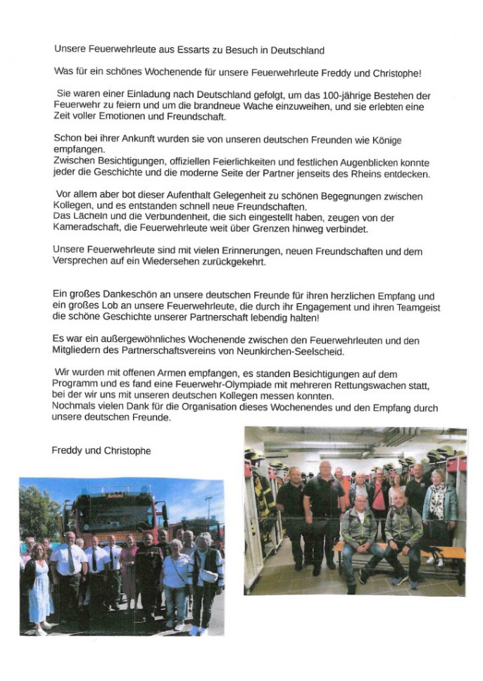 Bericht aus Frankreich zum Feuerwehrfest - Partnerschaftsverein Neunkirchen-Seelscheid