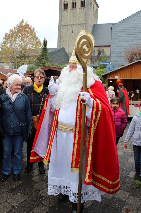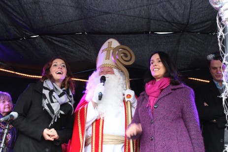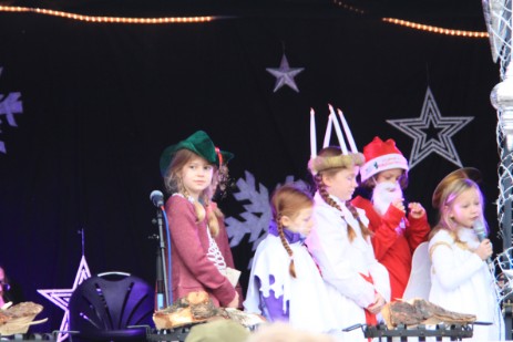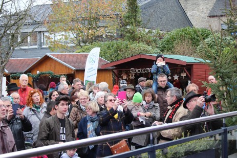 Pünktlich zur Weihnachtsmarkteröffnung standen die Gäste auf der Bühne, um Ihre Weihnachtsgrüße aus den Partnergemeinden an die Weihnachtsmarktbesucher zu übermitteln. Ein gemeinsames „Oh Du fröhliche...“ mit Nikolaus und Gästen schloss diesen Besuchsteil ab. Nun konnte entspannt über den Markt geschlendert werden, um die vorweihnachtliche Atmosphäre einzufangen. Natürlich wurden auch Tombola-Lose gekauft. Am Ende stand es zwischen Frankreich England und Polen 4:1:0! und der große Plüscheisbären war auf dem Weg nach Frankreich. Ein sichtbares Zeichen dafür war die frz. Bürgermeisterschärpe, die der Bär tragen durfte.