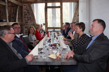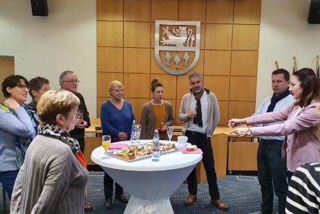 Die französische Delegation wurde von Frau Sander im Ratssaal mit Sekt und Häppchen bewirtet. Es gab kurze Vorträge zu Projekten und Struktur der Gemeindeverwaltung sowie anschließend eine Besichtigung von ausgewählten Räumen im Rathaus.