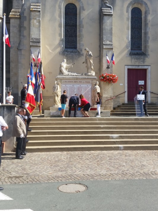 Das Défilee mit einer Musikkapelle an der Spitze, dann eine Abordnung der Feuerwehr, danach die Veteranen als Fahnenträger der Fahnen der zugehörigen Gemeinden und anschliessend der Bürgermeister mit unserer Bürgermeisterin und den Ehrengästen zog dann zur Kirche, wo die offizielle Zeremonie an der Haupttreppe vor der Gedenktafel für die im 1. Weltkrieg gefallenen Bürger stattfand. Die beiden Bürgermeister legten in Begleitung von zwei Kindern einen Kranz nieder.