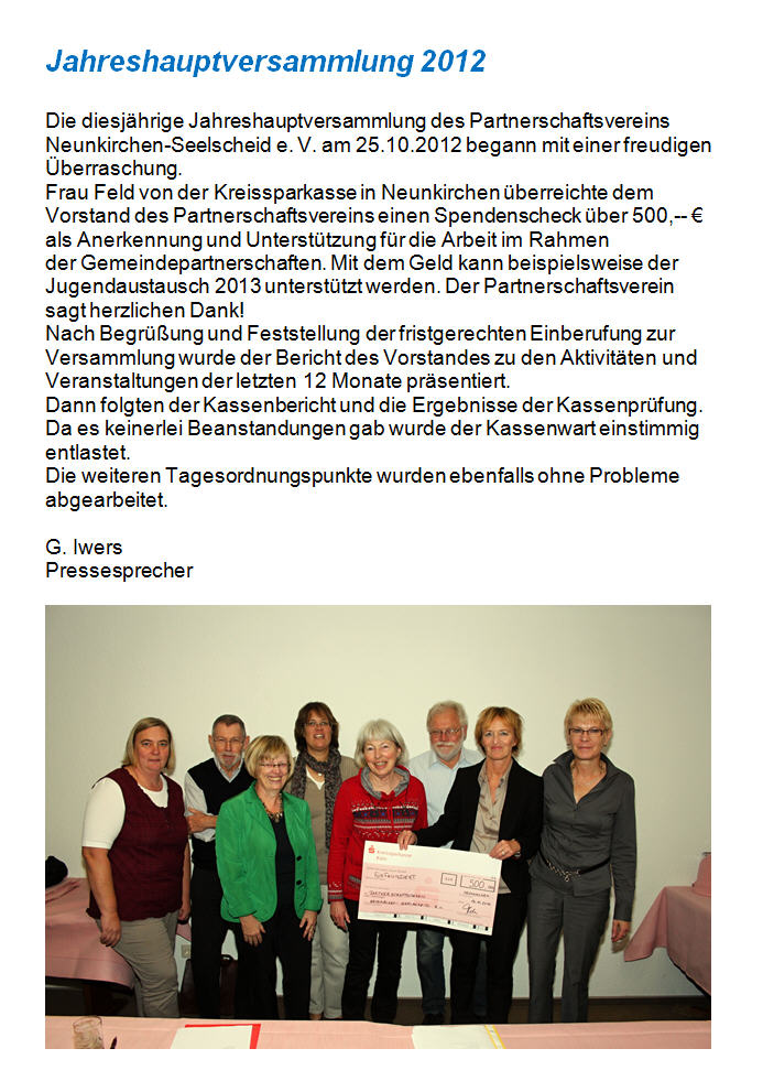 Jahreshauptversammlung 2012 - Partnerschaftsverein Neunkirchen-Seelscheid