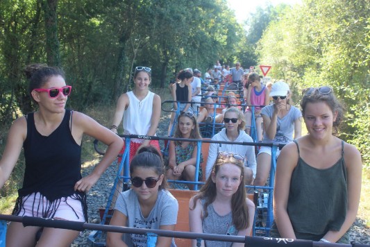 Dienstags fuhren wir nach Commequiers bei Coex zum Velo Rail. Hier kennt man dies unter Draisinen und man fährt auf stillgelegten Schienen ähnlich dem Fahrradfahren; 2 treten in die Pedale und 2 können sich zurücklehnen. Allerdings waren mitunter die Füße bei manchen schneller als das Gefährt und es kam zu kleineren Kollisionen.