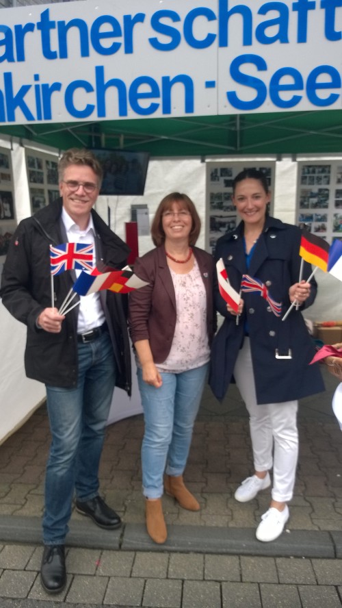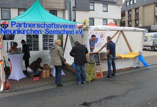 Das war die bange Frage, wird an diesem Tag etwas Sommer nach Seelscheid kommen? Um 9:30 Uhr trafen sich die „Aufbauer“, um den Stand des Partnerschaftsvereins aufzubauen. Der Ziehharmonika-Pavillon stand innerhalb kürzester Zeit, für den aus Holzelementen zusammen steckbaren Crêpe-Stand brauchte es etwas länger. Die Wände des Pavillons wurde mit Fotos verschönert, in der linken oberen Ecke ein TV installiert und das Partnerschaftsvereinsschild befestigt. Zwei Stehtische, mit weißen Hussen und Werbematerial verschönert, rundeten das Bild ab.